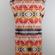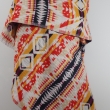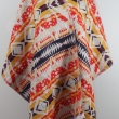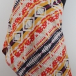 Kremowy damski gruby szal jakowy dwustronny we wzory azteckie w odcieniach pomarańczowym, żółtym i czarnym.