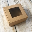 Brązowe opakowanie craft box z przezroczystym okienkiem w rozmiarze 6x6,5x3cm. Pudełko wykonane z papieru typu kraft.